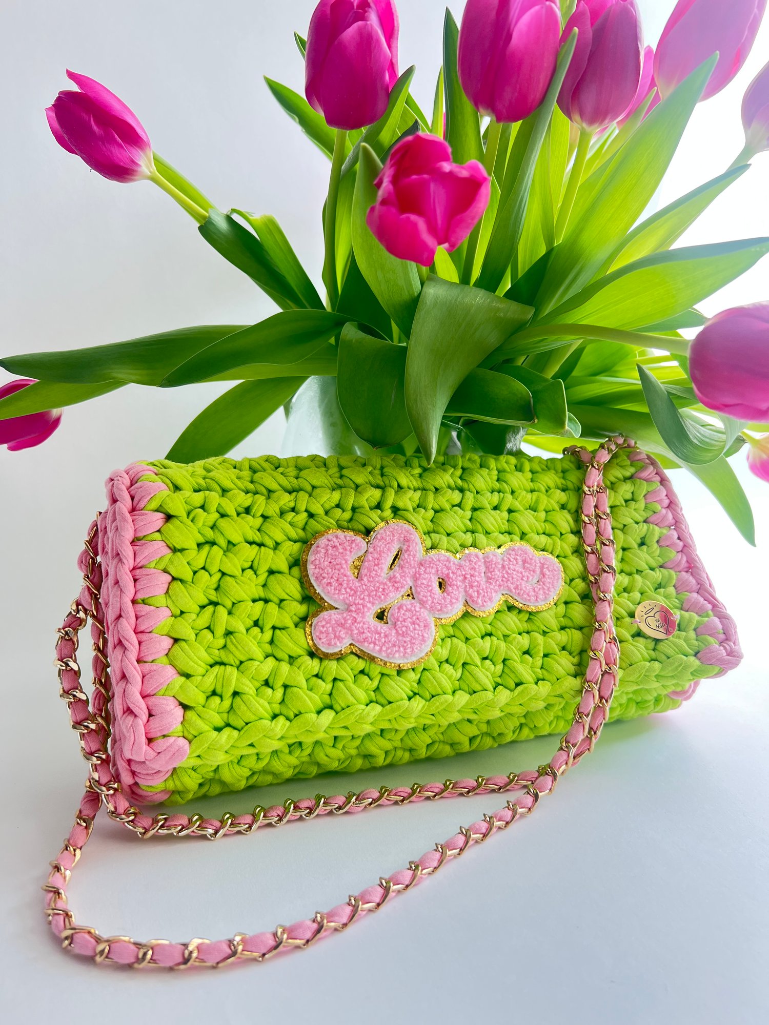 La bordure dorée du patch LOVE, apporte un touche d'éclat à l'ensemble et fait écho à la chaîne dorée.