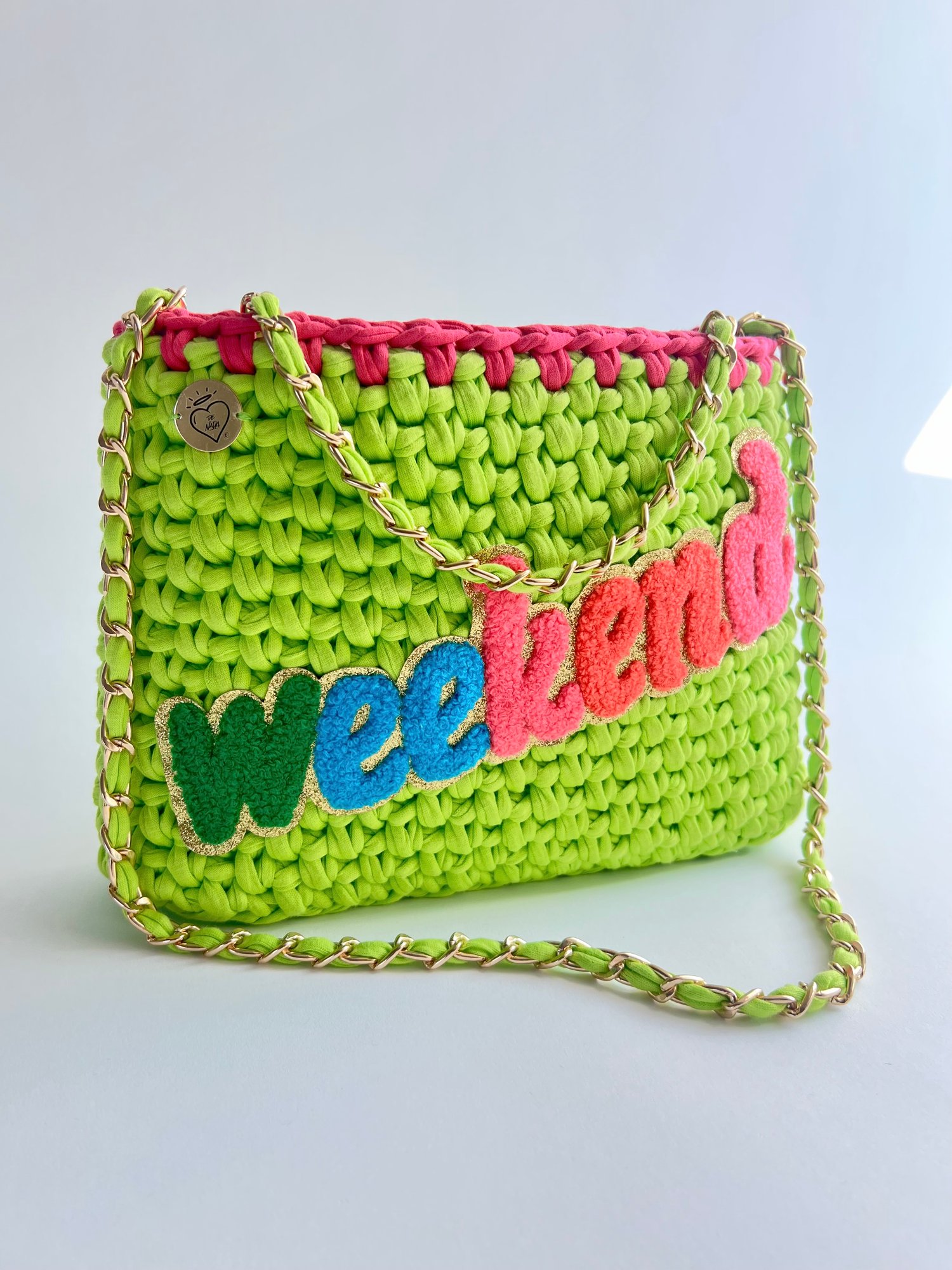 Son patch en éponge "Week end" au contour doré pailleté lui confère éclat et lumière.